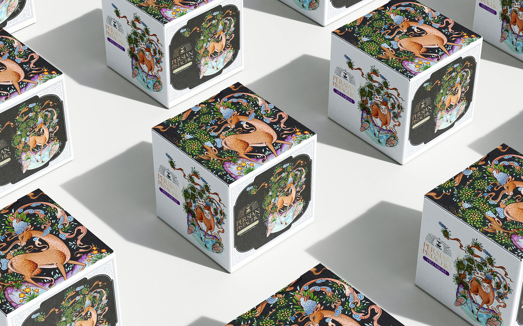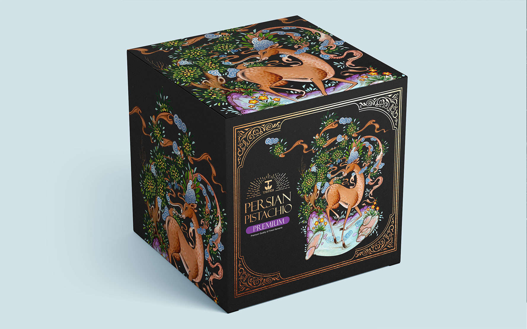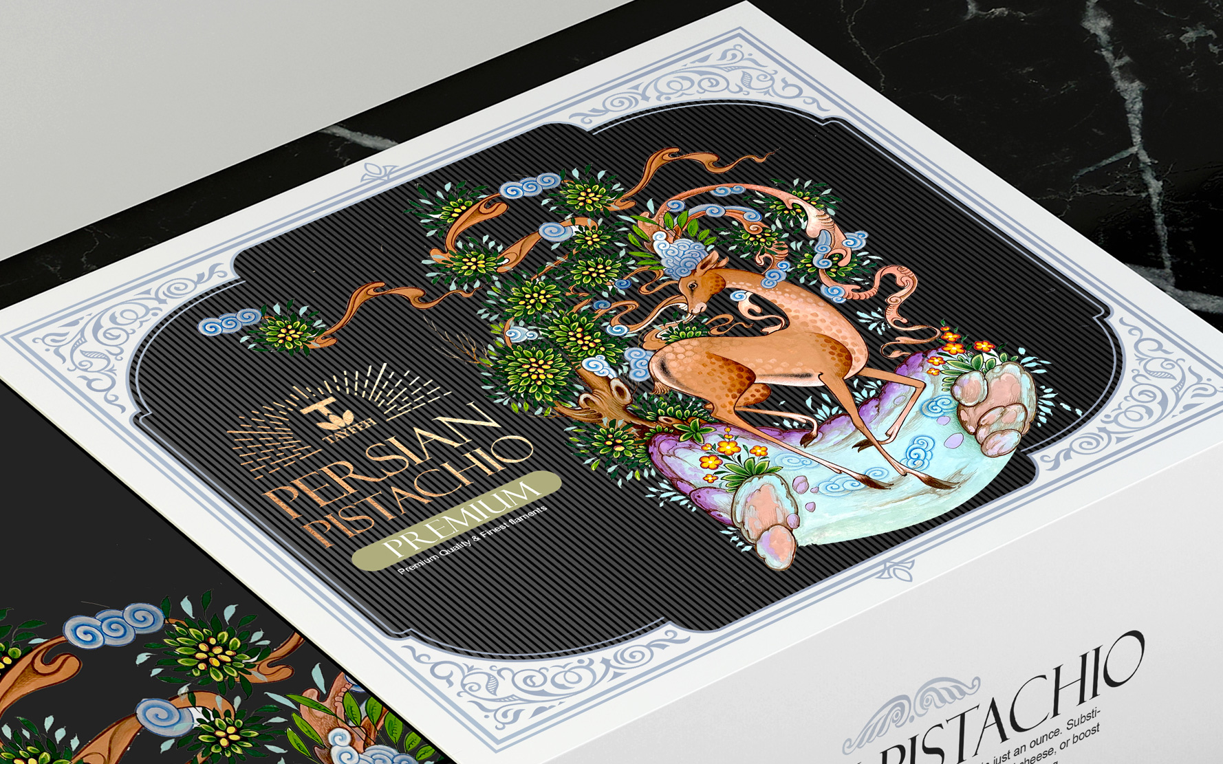 Tayfeh開心果升級包裝設計——在古代伊朗,鹿象征著統治者的榮耀,在東亞國家象征著腿長和長壽有尊嚴,在神話信仰中,鹿是體力和奔跑力的象征。它的角在節(jié)目中是太陽和夸張的象征。角代表放牧和農業(yè)。