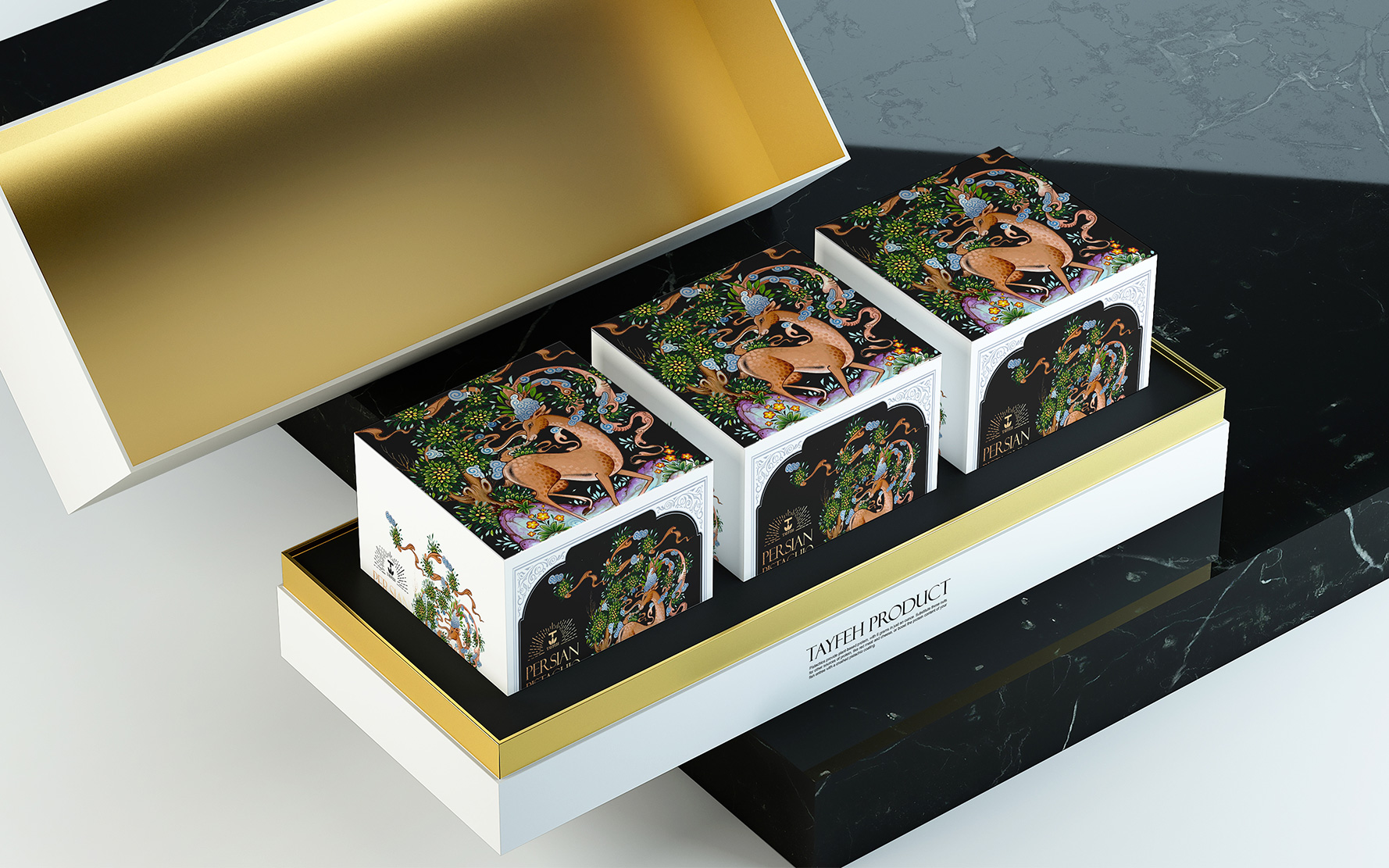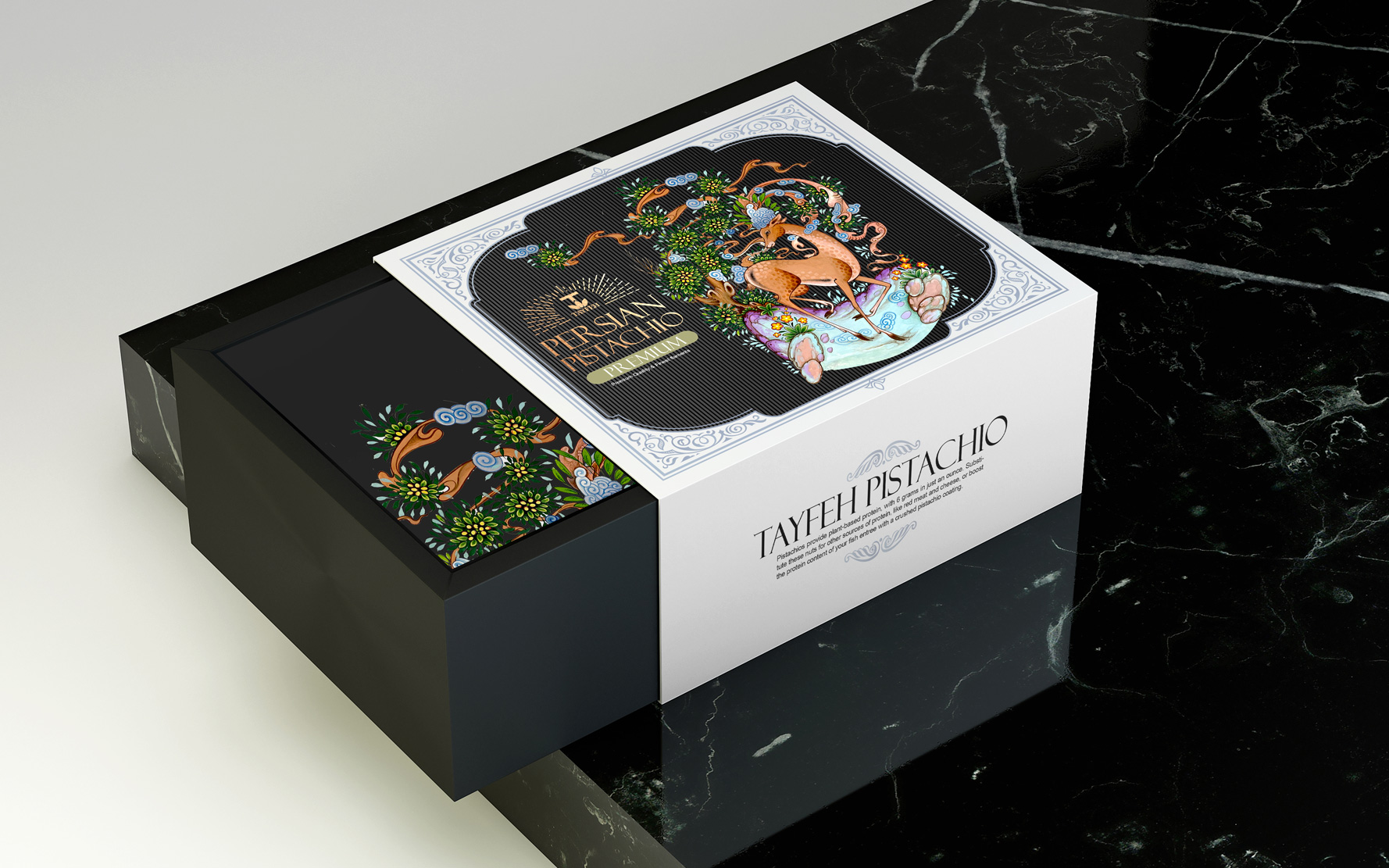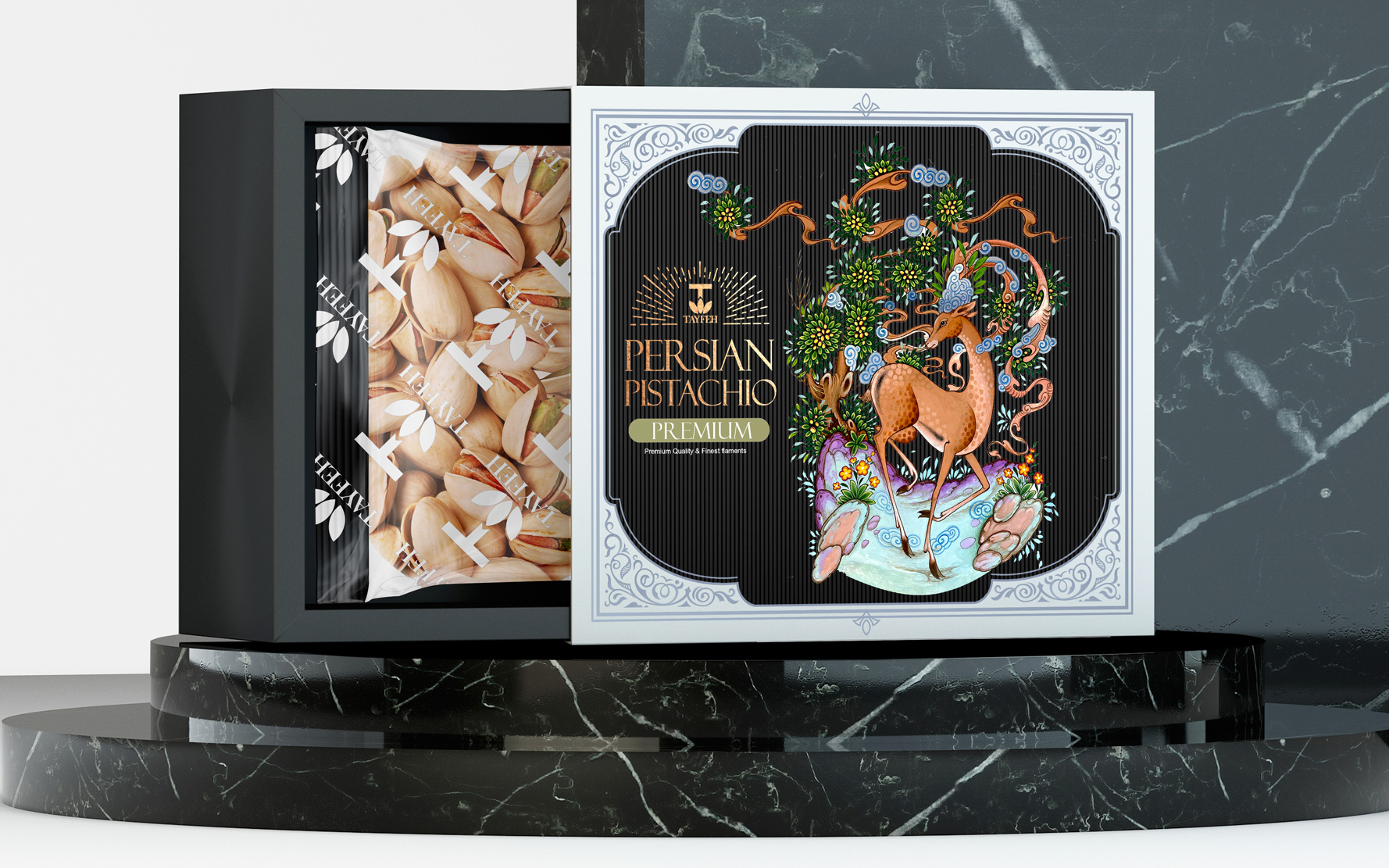 Tayfeh開心果升級包裝設計——在古代伊朗,鹿象征著統治者的榮耀,在東亞國家象征著腿長和長壽有尊嚴,在神話信仰中,鹿是體力和奔跑力的象征。它的角在節(jié)目中是太陽和夸張的象征。角代表放牧和農業(yè)。